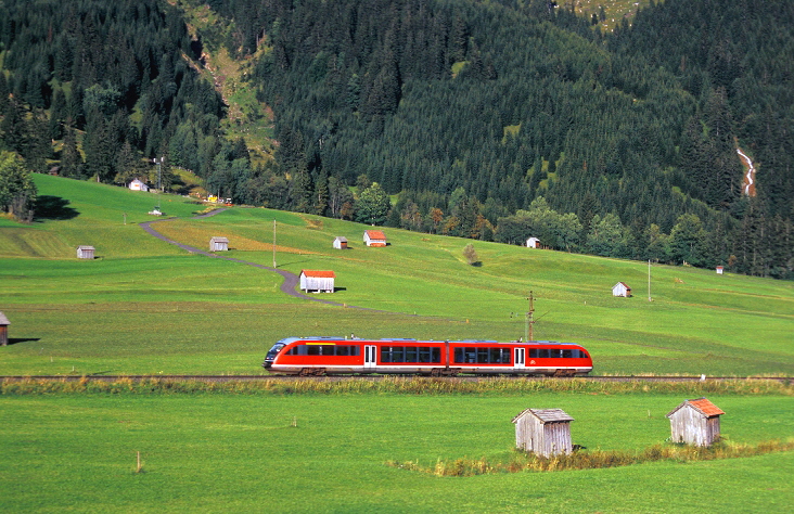 Bei Lähn hat der Desiro Triebwagen am 01. September 2006 den höchsten Punkt der Außerfernbahn nun überschritten und rollt in Richtung Lermoos und Ehrwald-Zugspitzbahn zu Tal. |