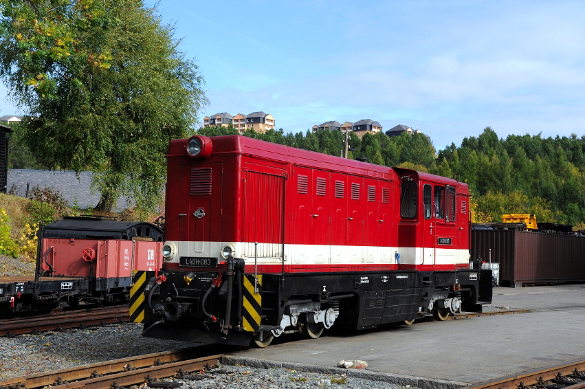Kurz vor Oberwiesenthal überquert der Zug eine markante Trestlework Bücke. Im Hintergrund erkennt man die Fichtelberg Seilbahn (mit den gelben Stützen), sowie links im Bild die Ski Sprungschanze von Oberwiesenthal. Der Ort liegt auf 914 m Seehöhe und ist dadurch ein beliebtes Wintersportgebiet. Aber auch im Frühjahr, oder im Sommer kann man hier sehr schön Wandern, oder Rad fahren.