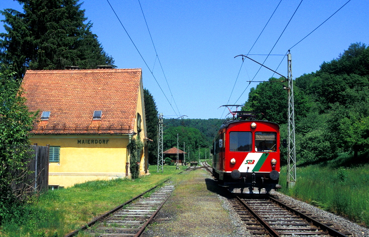 Am späten Nachmittag des 04. Juli 2017 hat der ET 1 soeben den Bahnhof von Maierdorf verlassen und strebt nun Bad Gleichenberg entgegen. Gleich hinter dem Bahnhof von Maierdorf erreicht der Zug die nächste Steigungsrampe mit bis zu 35 Promille. Dieser Abschnitt verläuft jedoch sehr windungsreich in einem dichten Waldgebiet. |