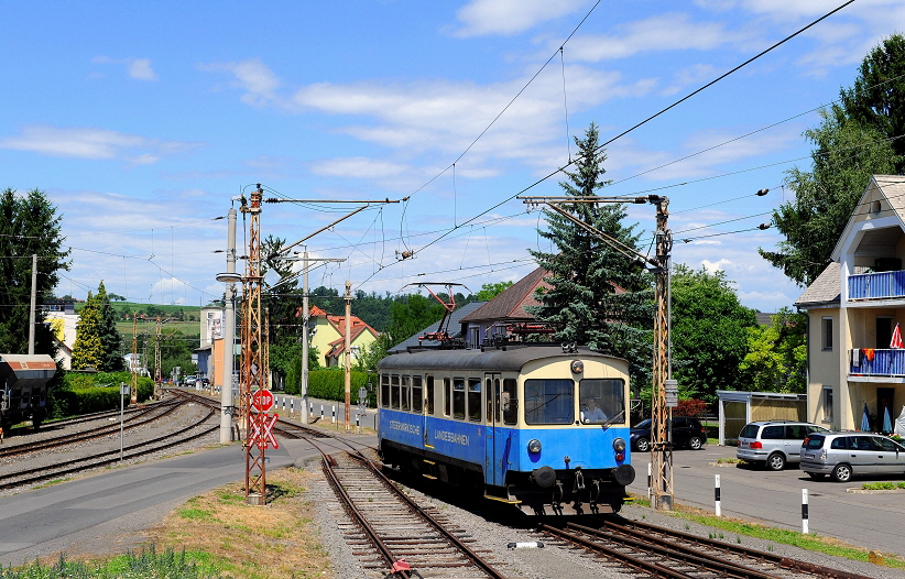 Am Vormittag des 07. Juli 2017 erreicht der ET 1 (Grazer Wagonfabrik, Baujahr 1930) in wenigen Augenblicken die kleine Haltestelle Trautmannsdorf in der Steiermark und setzt nach kurzem Aufenthalt seine Reise bis nach Bad Gleichenberg fort. |