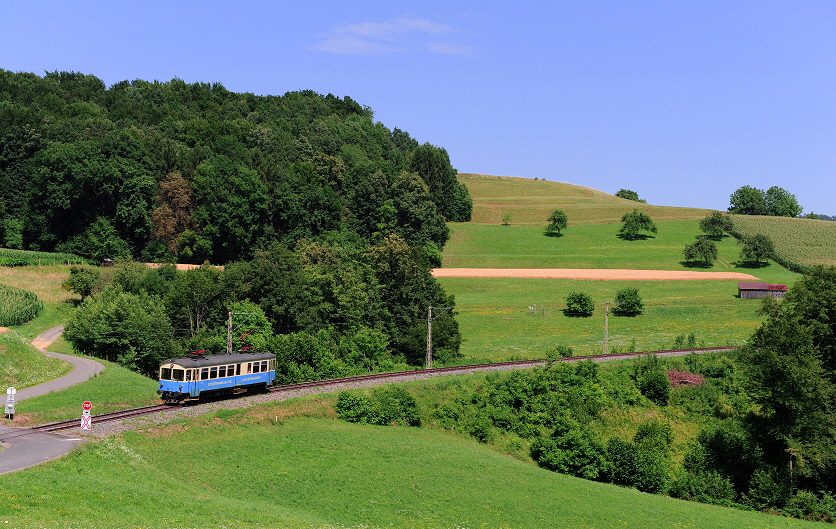 Kurz vor Hofstätten ist der ET 1 am Vormittag des 07. Juli 2017 unterwegs. Dieser Blick zeigt den Gegenbogen zu der oberen Aufnahme. |