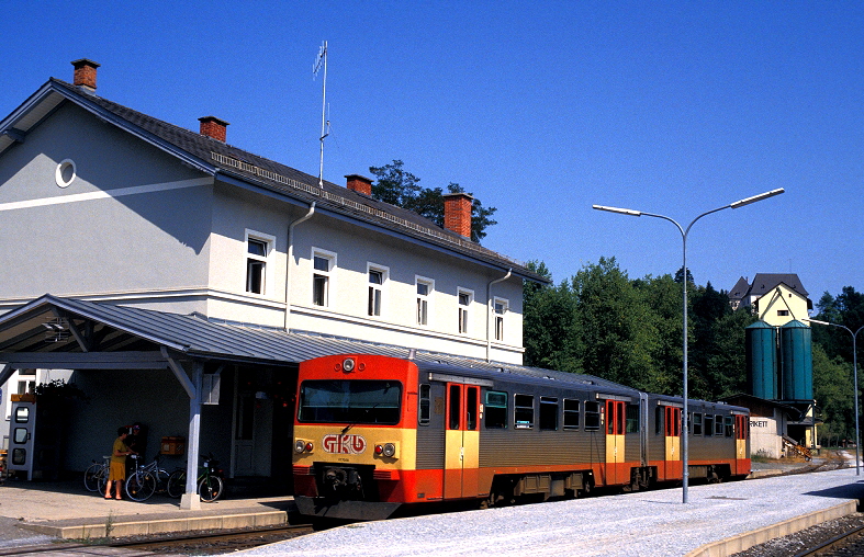 Die Graz- Köflacher Eisenbahn (GKB) kaufte in den Jahren 1953-1955 vier Stück der Reihe VT 50.01 bis .04 (einmotorige Version) und dann zwischen 1953 und 1968 die zweimotorigen Triebwagen mit der Nummerierung VT 10.01 bis 09. Die angebauten Puffer, wie auch das dritte Spitzenlicht auf dem Dach entsprachen in etwas der Ausführung eines VT 95 der Deutschen Bundesbahn (DB). Außerdem erhielten die Schienenbusse im Gegensatz zu den DB Fahrzeugen andere Fensterkonstruktionen, die eine größere Öffnung erlaubten. Als “Roter Blitz” war der Schienenbus bei der GKB zu Zeiten der Inbetriebnahme in den 1950er Jahren eine Sensation. Am 02. September 1992 ist der VT 10.03 mit einem weiteren Motorwagen und 2 Mittelwagen in der kleinen Haltestelle Gaisfeld eingefahren. An diesem Tag war die Garnitur als Schülerzug auf dem Weg nach Köflach. |