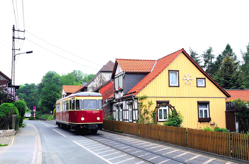 Am 27. Mai 2016 musste wieder einmal der ex. KAE Triebwagen, mit der heutigen HSB Nummer 187 013-8 einen Halberstädter Triebwagen ersetzen. Inmitten der Wernigeroder Kirchstraße rollt der Zug seinem Ziel in Wernigerode (Hauptbahnhof) entgegen. |