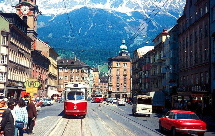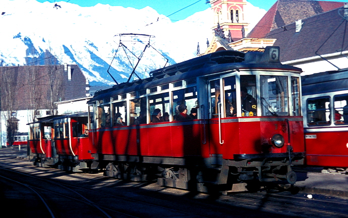 Der Triebwagen No. 3 ist soeben im Endbahnhof Fulpmes (Stubaitalbahn) eingetroffen. Die alten Holzmasten mussten in der Zwischenzeit modernen Stahlträger Konstruktionen Platz machen. Seit einigen Monaten sind hier nun auch die neuen Flexity Triebwagen der Fa. Bombardier im Einsatz. Die Aufnahme entstand im April 1974.