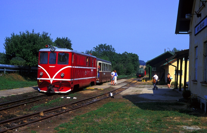 Nach 33 Kilometern ist der Endbahnhof Nova Bystrice erreicht. Die 705 909-0 hat am 20. August 1994 soeben die Rangiergeschäfte erledigt und setzt zur Rückfahrt nach Jindrichuv-Hradec an das andere Zugende um, während die Reisenden auf die Bereitstellung der Personenwagen warten. Von Nova Bystrice sollte die Strecke mit der österreichischen Waldviertelbahn (in Litschau) verbunden werden. Der 1. Weltkrieg machte dieses Projekt leider zunichte. Die Grenze zu Österreich (bei Reingers/ Grametten im Waldviertel) befindet sich am Ortsrand von Nova Bystrice (Neu Bistritz). |