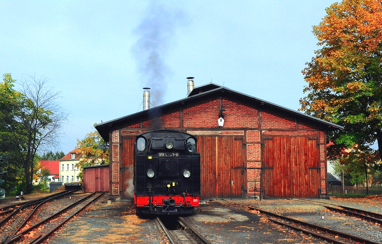 Nach rund 17 Kilometern erreicht der Zug den Bahnhof von Radeburg. Kurz nach der Ankunft wird die Lokomotive vor dem schönen alten Lokschuppen mit Wasser versorgt und die Lok für die Rückfahrt nochmals kurz abgeschmiert. Am 05. Oktober 2018 nutzten viele Fahrgäste, bei sehr warmen Temperaturen von bis zu 25 Grad den Dampfzug. |