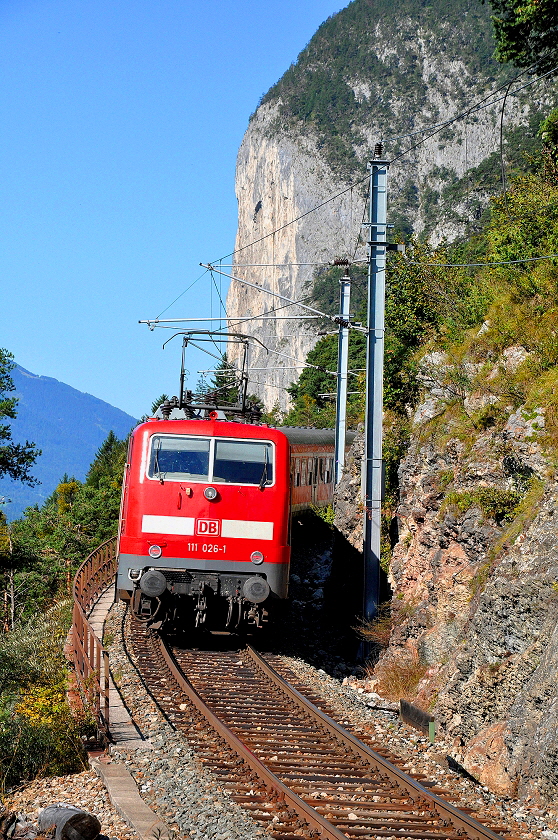 Die wohl bekannteste Fotostelle der Mittenwaldbahn stellt die Brücke über die Schlossbachklamm dar. Am Nachmittag des 06. September 2005 erreicht der Güterzug aus dem Außerfern dieses Streckenstück zwischen den Haltestellen Leithen und Hochzirl. Von der Station Leithen führt ein immer schmaler werdender Wanderweg bis hierher. Trittsicherheit, gutes Schuhwerk und eine gute Kondition, sowie ein wenig Schwindelfreiheit sollten hier allerdings mitgebracht werden !! In der Nähe des Fotopunktes gibt es sogar eine kleine Bank, von der man die landschaftliche Schönheit der Schlossbachklamm richtig geniessen kann. |