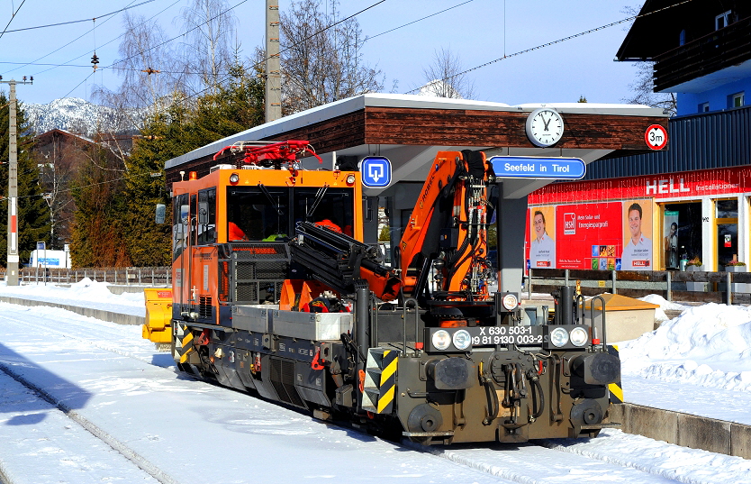 Am Mittag des 03. Januar 2011 wartet der Arbeitszug X 630 503-1 der ÖBB im Bahnhof von Seefeld in Tirol auf die Ausfahrt in Richtung Innsbruck. Neben einem Kran und div. anderen Anbauten, verfügt das Fahrzeug auch über eine Funktion als Schneefräse (am anderen Ende des Fahrzeuges zu sehen). |
