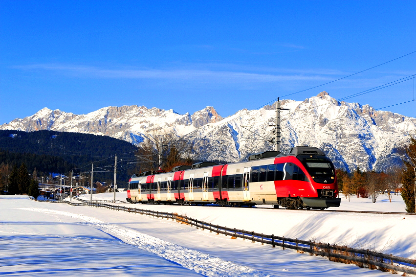 Unterhalb des Wetterstein-und Karwendel Massivs ist am Nachmittag des 03. Januar 2011 der ÖBB TALENT Triebwagen 4024 099-6 als S-Bahn in Richtung Innsbruck unterwegs. Die Aufnahme entstand bei Seefeld-Golfplatz (Richtung Reith bei Seefeld). |