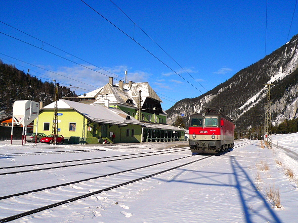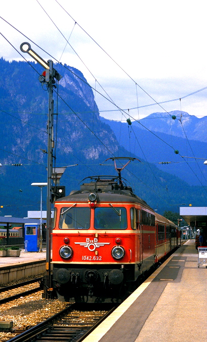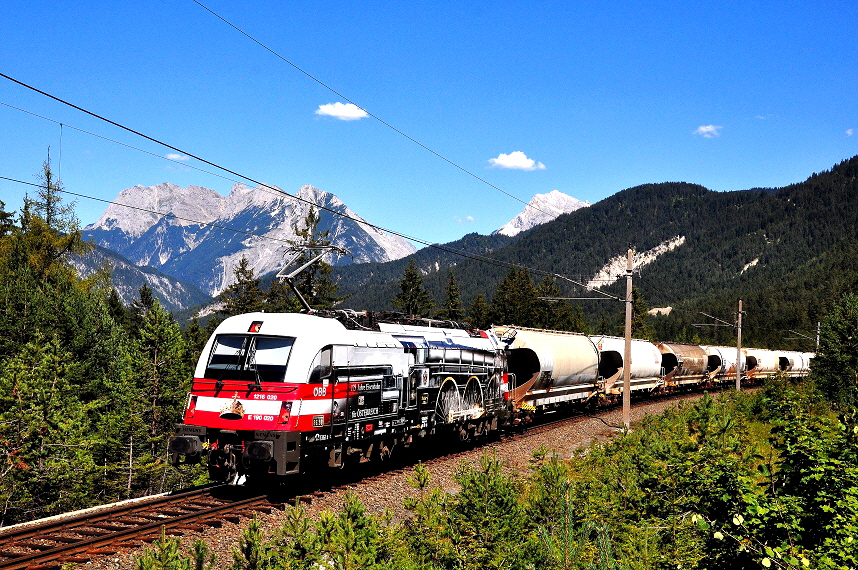 Am Nachmittag des 06. September 2005 erreicht der Güterzug aus Reutte in Tirol die Region rund um Seefeld. Eine Doppeltraktion bestehend aus zwei Lokomotiven vom Typ TAURUS (1016/1116) ziehen einen schweren Güterzug vor der Karwendelgruppe in Richtung Innsbruck. |