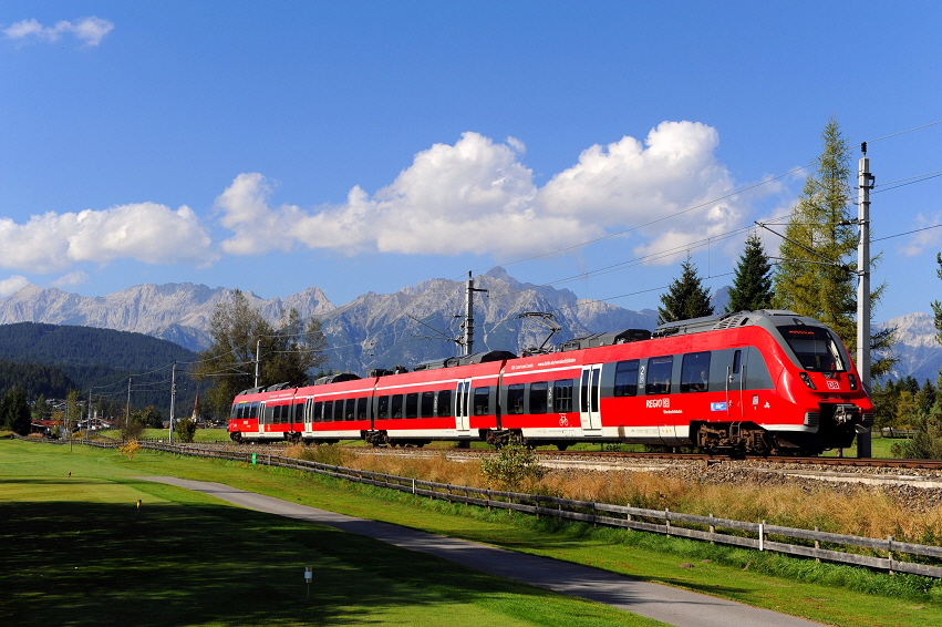 Zu jeder Jahreszeit und für “fast” jeden Zug ist das Motiv am Seefelder Golfplatz einen Besuch wert. Bei schönem Wetter braucht man in den den Sommermonaten entweder das Glück, dass gerade kein Golfspieler an dieser Abschlagstelle Aufstellung genommen hat, oder man trifft auf verständnisvolle Golfspieler, die für den Eisenbahn Fotografen kurz ihr Spiel unterbrechen. So geschehen am 30. September 2016, als der Regionalzug aus Richtung München HBF diese Szenerie passierte. |