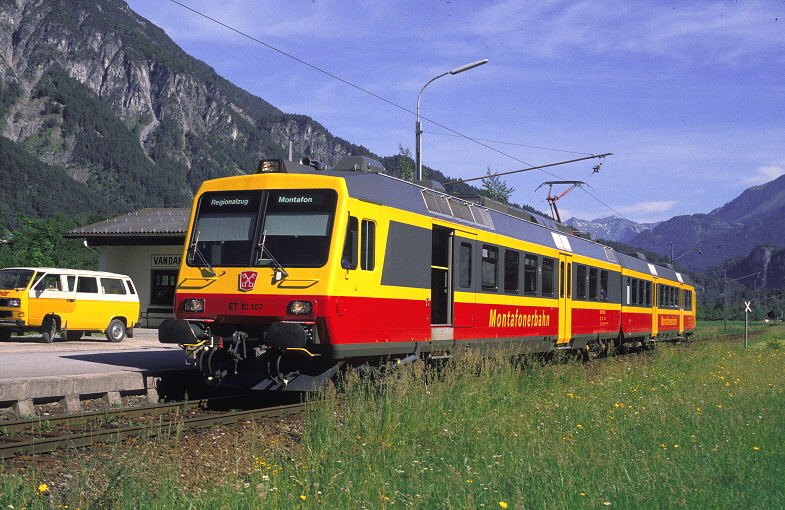 Am 28. Juli 1985 hat der ET 10.101 soeben den Bahnhof von Tschagguns in Richtung Schruns verlassen. Im Hintergrund ist die markante Pfarrkirche von Tschagguns zu sehen. |