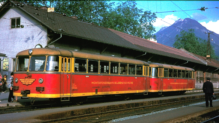 Nach 12,8 Kilometern erreicht der Reisende den Endpunkt der Montafonerbahn in Schruns. Dort strebt der ET 10.101 soeben dem dortigen Depotbereich entgegen (30. Juli 1985). Dieses Fahrzeug wurde im Jahr 1991 an die Firma Stern & Hafferl für den Einsatz als Reserve Triebwagen auf der Strecke Lambach-Haag am Hausruck verkauft. Inzwischen wurde die Bahn dort eingestellt und der Triebwagen im Februar 2012 verschrottet. |
