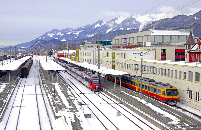 Zwischen den Stationen Tschagguns und dem Endbahnhof in Schruns verläuft die Trasse durch einige landwirtschaftlich genutzten Flächen hindurch. Kurze Zeit später erreicht der Zug die ersten Häuser in einem Mischgebiet (Wohnbebauung und Industrie Ansiedlungen) von Schruns. Am 04. Januar 2019 fahren im Taktfahrplan zunächst der in den neuen Hausfarben (gelb/lichtgrau, Schräg Design) der MBS lackierte Triebwagen ET 10.121 und später der ÖBB Talent Triebwagen mit der Aufschrift “S-Bahn Vorarlberg” in Richtung Schruns. |