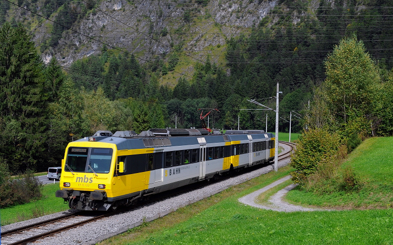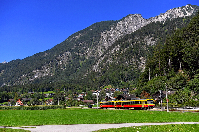 Der ET 10.122 verlässt am 01. Oktober 2012 soeben den Bahnhof von Tschagguns. Im Hintergrund ist die barockisierte Pfarrkirche von Tschagguns zu sehen. |