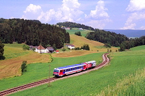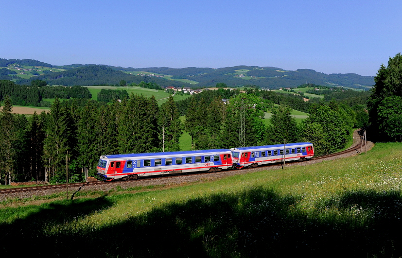 Am späten Nachmittag des 07. Juni 2019 sind zwei Diesel Triebwagen der ÖBB Reihe 5047 kurz vor Rohrbach-Berg in Richtung Aigen-Schlägl unterwegs. Von diesem Foto Standpunkt kann man die charakteristische Landschaft des Mühlviertels von einer Bank genießen. |