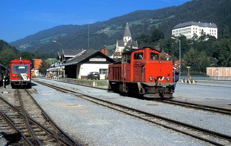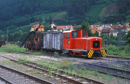 Am 11. August 1998 verschiebt die VL 12 im Bahnhof von Murau, während der Triebwagen auf seinen nächsten Einsatz wartet. Die Szenerie mit Burg und Kirche läßt sich leider in dieser Form nicht mehr fotografieren, da hier nun ein modernes Bahnsteigdach aus Holz den Blick versperrt. |