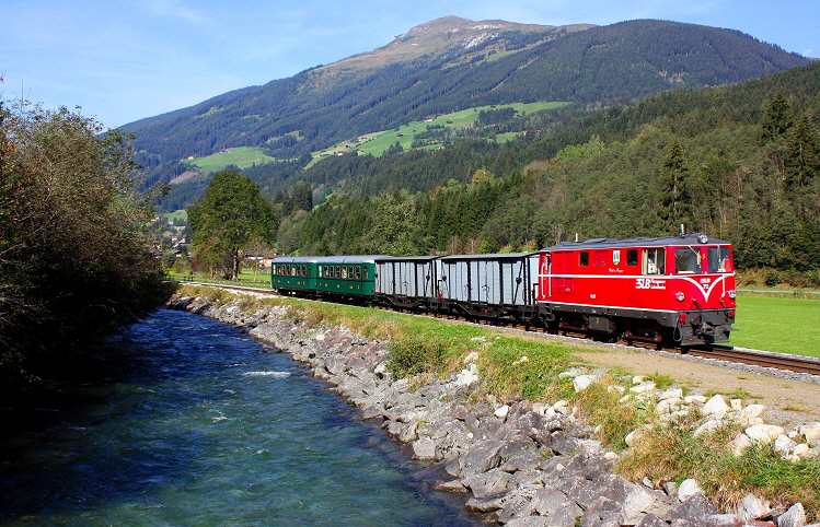 Ralf Kirion konnte den Sonderzug zur “Schmalspur-Expo” am 03. Oktober 2010 zwischen den Stationen Hollersbach und Rettenbach auf der Rückfahrt nach Zell am See, am Ufer der Salzach schön in Szene setzen.