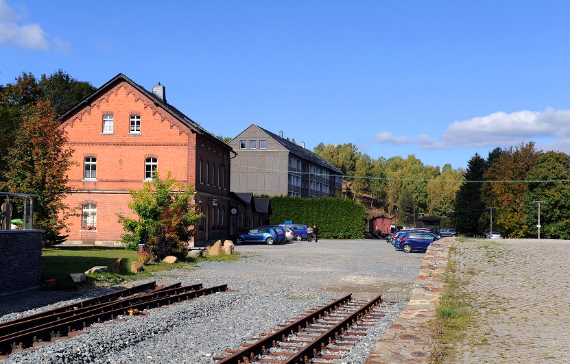 Vor-und hinter dem alten Bahnhof von Jöhstadt liegen bereits auch wieder die Schmalspurgleise. Dieses Szenerie wird aktuell noch von dem DDR Plattenbau (erbaut Ende der 1980er Jahre) dominiert. Nach letzten Informationen soll es in den nächsten Jahren eine Regelung geben, mit der dieses Bauwerk dann auch wieder verschwindet. Damit wäre der Bahnhofsbereich von Jöhstadt wieder authentisch. Diese Aufnahme zeigt die Situation vom 29. September 2018. |