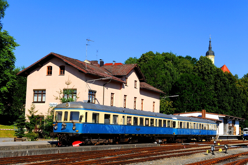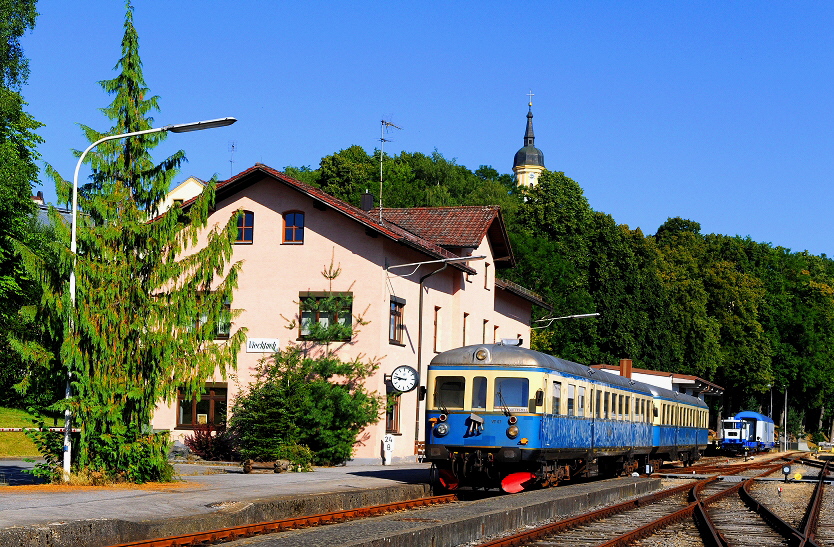 Die Regentalbahn und der Verein Wanderbahn im Regental (WIR) bemühen sich sehr aktiv um die Erhaltung der reizvollen Bahnlinie von Viechtach nach Gotteszell, die in weiten Teilen dem Schwarzen Regen entlang führt. Am Morgen des 21. Juli 2013 steht der VT 07 (Fa. Esslingen, Baujahr 1952) im Bahnhof von Viechtach für die Sonderfahrt des Vereins bereit. Der Triebwagen kam 1977 von der Frankfurt-Königsteiner Eisenbahn zur Regentalbahn. Nach zeitweiser Stillegung des Fahrzeuges drohte eine Zeitlang sogar die Verschrottung. Der Verein Wanderbahn im Regental konnte die Regentalbahn glücklicherweise vom historischen Wert des Fahrzeugs und dessen Nutzung für den Tourismus überzeugen. Der Steuerwagen VS 28 (Baujahr 1956) komplettiert den Zug auf ideale Weise. Hoch über dem Bahnhof erkennt man die Stadtpfarrkirche St. Augustinus, eine der schönsten Rokoko Kirchen der Region. |