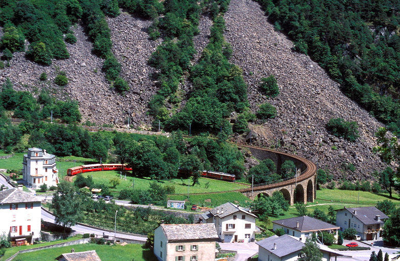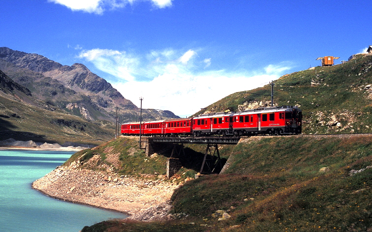 Stromversorung: 1.000 Volt (Gleichstrom). Bis auf die neuen “ALLEGRA” Triebwagen können daher keine Fahrzeuge vom Stammnetz auf der Berninabahn eingesetzt werden.