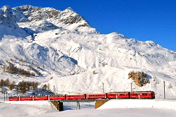 Aus einer anderen Perspektive hat man (nahe der Station Punt Muragl) einen eindrucksvollen Blick auf die verschneiten Berggipfel, als am 08. November 2016 die Ge 6/6 II. (Nr. 703) mit dem Arbeitszug G 5113 diesen Abschnitt mit Fahrtziel Pontresina passiert. Die Ge 6/6 II. ist mit dieser Fracht sicherlich nicht übermäßig ausgelastet. |