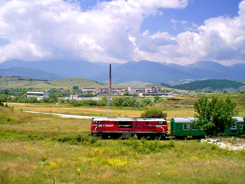 Auf der Hochfläche bei Razlog passiert die 77.008-1 am 05. Juli 2009 eine alte Industrieruine. Patrick Aulbach fotografierte den P 16103 an dieser Stelle. |