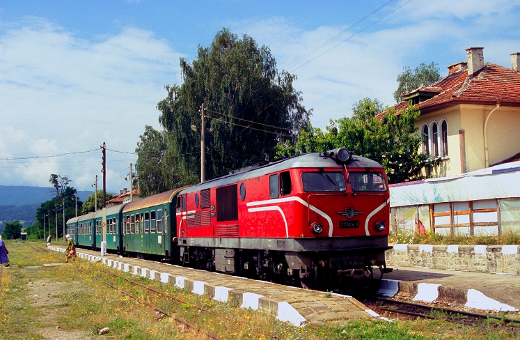 In der Region zwischen Sveta Petka und Belice lebt eine Gruppe, die dem Volksstamm der Pomaken angehört. Zur Erläuterung: Die Pomaken sind Bulgaren, die sich während der türkischen Zeit zum Islam bekehrt hatten. Von diesem Volksstamm leben heute alle ca. 300.00 Pomaken in den Rhodopen. Daher finden sich in diesem Bereich auch einige weiße Moscheen mit ihren Minaretten. Am 05. Juli 2009 fotografierte Ralf Kirion den Personenzug 16103 mit der 77.008 vor Cherna Mesta. |