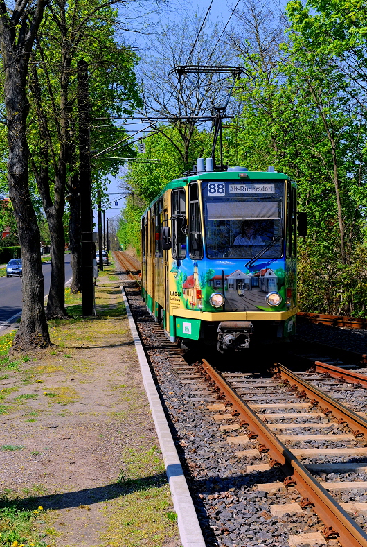 Am späten Nachmittag des 24. April 2011 ist ein TATRA Triebwagen auf dem Weg nach Alt-Rüdersdorf und wird in wenigen Augenblicken die Haltestelle Heinitzstraße erreichen. Inzwischen hat die Kopfsteinpflaster Straße eine Modernisierung erfahren & so präsentiert sich die Szenerie nun völlig anders. |