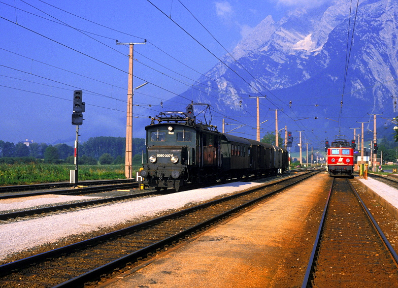 Am Nachmittag des 06. August 1989 steht im Bahnhof von Stainach-Irdning die 1080.007 (Milchzug) und die 1041.017 und warten auf die Weiterfahrt ins Salzkammergut. |
