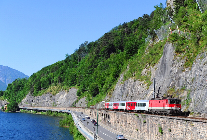 Oberhalb des Traunsee nahe der Haltestelle Ebensee-Landungsplatz verläuft die Salzkammergutbahn auf einem gemauerten Lehnenviadukt. Die 1144.113 ist am Morgen des 28. Mai 2017 in Richtung Gmunden unterwegs. |