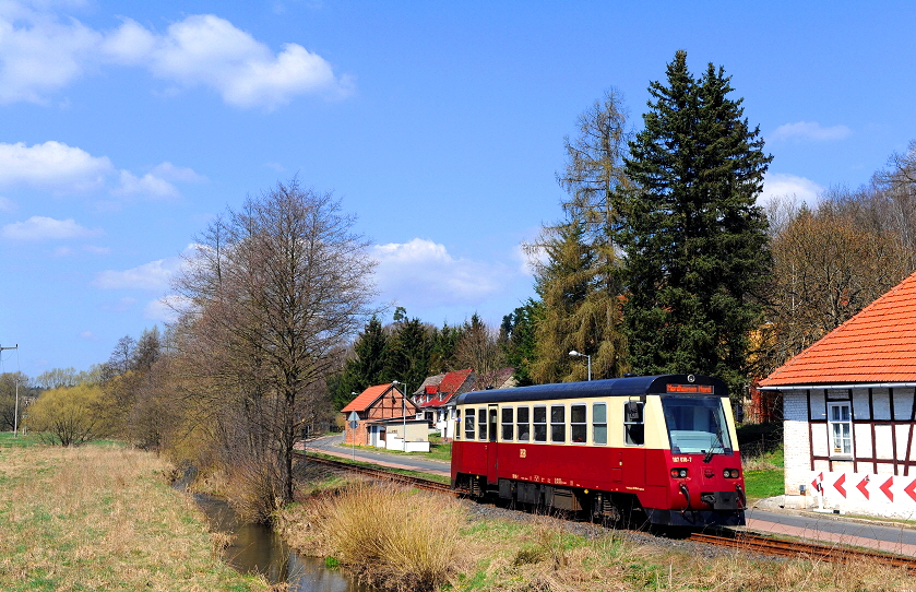 Am Vormittag des 19. April 2015 hat der Triebwagen soeben die Ortsdurchfahrt von Straßberg passiert und rollt langsam dem Bahnhof Straßberg (Harz) entgegen.