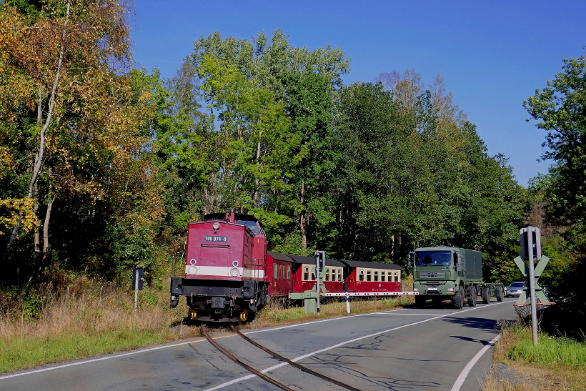 Am 01. Oktober 2020 fährt die 199 874-9 gegen Mittag geschoben von Harzgerode kommend in Richtung Alexisbad. Der Zug wird über die Bauchladen Bedienung des Lokführers (Ein-Mann Betrieb) gesteuert.