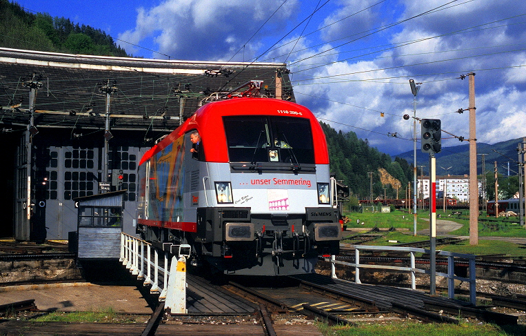 Zwei Lokomotiven erreichen mit einem schweren Güterzug am Nachmittag des 30. Juni 1995 den Bahnhof Semmering. Die Vorspann- Lok (1042.568) wird nach Ankunft des Zuges auf der Passhöhe abgekuppelt und wird einen Güterzug als Brems- Lok nach Payerbach befördern. In Payerbach und Mürzzuschlag werden die Vorspann-Lokomotiven bereitgehalten. Ein Schiebebetrieb wie auf anderen Gebirgsbahnen ist aufgrund der sehr engen Bögen am Semmering verboten. |