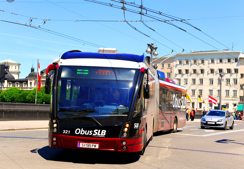 Die Obusse im “METRO-STYLE” Design von der Fa. SOLARIS & CEGELEC prägen das Bild der Zukunft in der Salzburger Innenstadt. Am 28. Mai 2013 überquert der Obus mit der Betriebsnummer 321 soeben die Staatsbrücke und biegt in die Straße Innerer Stein (rechts der Salzach) ein. |