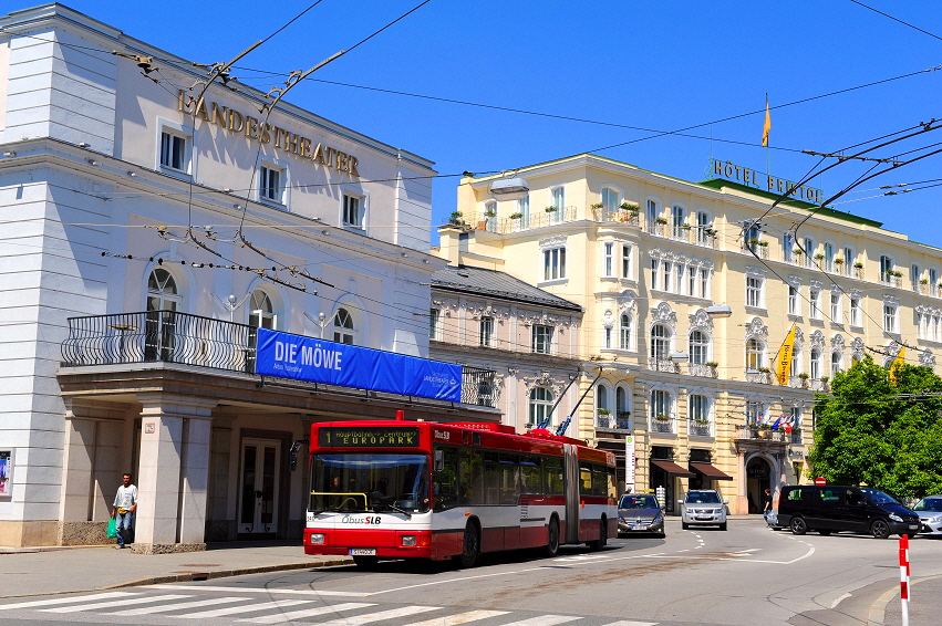 In den Jahren 2000- 2005 kamen 30 Fahrzeuge des belgischen Herstellers Van Hool & Kiepe (Elektrik) in die Mozartstadt. Am 28. Mai 2013 befährt ein solcher Obus mit Komplett Reklame für den Skicircus Saalbach-Hinterglemm-Leogang die Staatsbrücke. Im Hintergrund ein Erdgasbus der ALBUS Salzburg GmbH. |