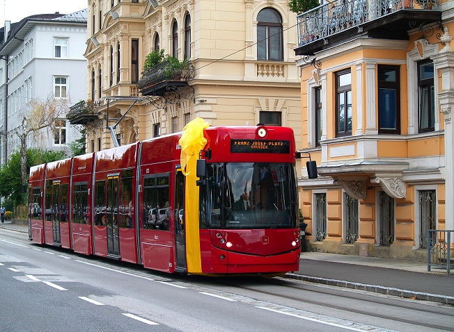 Im Zeitraum vom 28. August 2008 bis 01. Oktober 2008 kam es zu Probefahrten eines neuen Flexity-Outlook Triebwagens der Innsbrucker Verkehrsbetriebe (IVB) auf der Stern & Hafferl Linie von Gmunden (Seebahnhof) nach Vorchdorf-Eggenberg (28.08. - 04.09.2008) und auf der Linie “G” der Gmundner Straßenbahn (12.09. - 01.10.2008). Am 12. September 2008 stand dann das Stadtfest in Gmunden ganz im Zeichen des neuen Straßenbahn Projektes. Unter dem Motto “Dieser Tag fährt Straßenbahn - die Zukunft in Gmunden auch” wurde der Triebwagen No. 305 der IVB an diesem Tag von vielen Fahrgästen genutzt. Das Echo zum neuen Fahrzeug war dabei durchweg positiv. Dr. Ludwig Ekl konnte den neuen Triebwagen an diesem Tag in Gmunden in Szene setzten. |