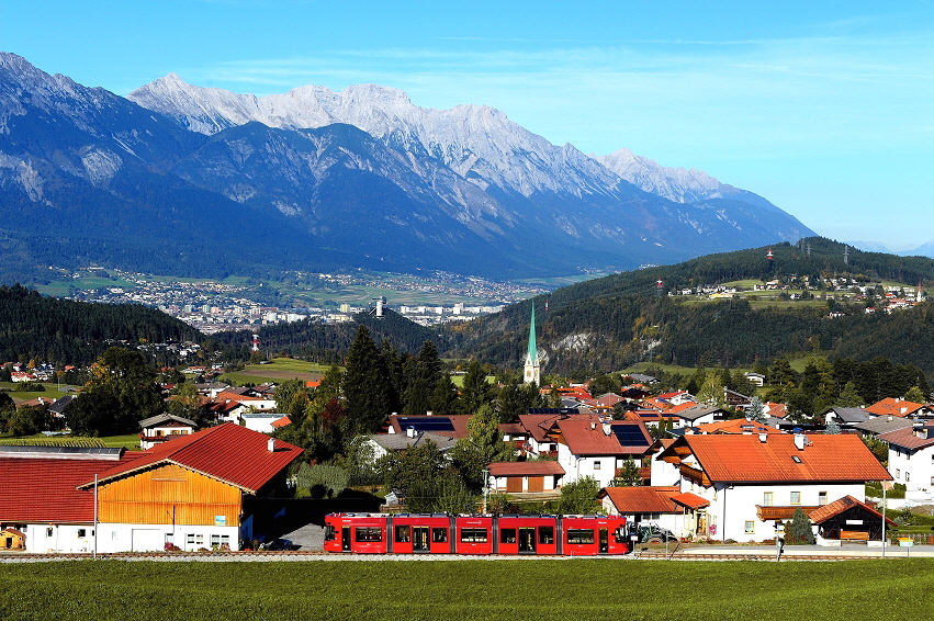 Inzwischen ist die Stubaitalbahn fest in der Hand der neuen Flexcity-Outlook Triebwagen von Bombardier. Am späten Nachmittag des 06. Oktober 2010 konnte man nahe der Station Nockhofweg-Muttereralmbahn eine schöne Fernsicht auf Mutters, Innsbruck, die Bergisl Schanze und Teile der Nordkette geniessen. |