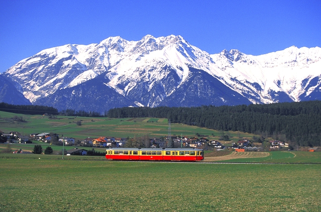 Kurz nach der Ausfahrt aus der Station Telfser Wiesen hat man wieder einen prächtigen Blick auf die Berggipfel. Am Morgen des 11. März 2005 fand soeben die Zugkreuzung in der Ausweiche Telfser Wiesen statt. Der Werbewagen ist auf dem Weg nach Fulpmes, während der creme-rote Triebwagen (im Hintergrund) bald die Weiterfahrt nach Innsbruck antreten wird. |