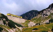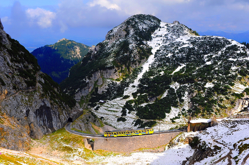 Von der kleinen Kapelle auf dem Wendelstein (Bild oben) und vom Wanderweg darunter (Bild unten) hat man einen schönen Blick auf die Trassierung der Wendelsteinbahn im Bereich der “Hohen Mauer”. Am Morgen des 14. September 2012 hat der Zug soeben die Lawinenschutzgalerie verlassen und passiert gerade den sog. “Reindler Kessel”. |