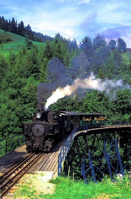 Die beiden Trestlework-Brücken (Wetterbach-und Hühnernestgraben) bilden einen der vielen Höhepunkte im Verlauf einer Fahrt auf der Bergstrecke der Ybbstalbahn.