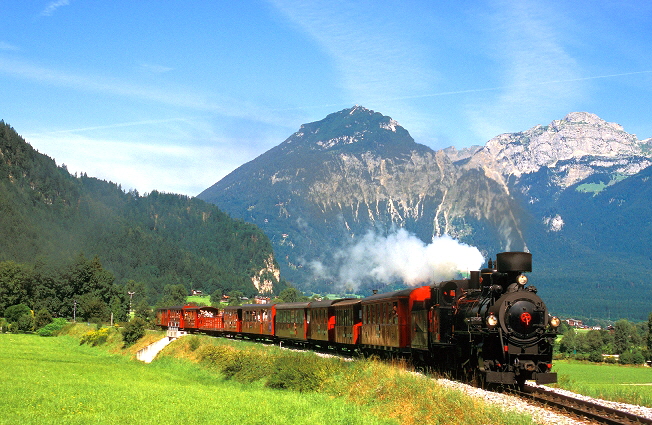 Eine nicht alltägliche Bespannung konnte am Morgen des 11. August 2008 bei Erlach aufgenommen werden. Die als zweite Dampflok an diesem Tag eingesetzte Lok Uh 5 “Gerlos”, wurde in Fügen-Hart schadhaft abgestellt und die im Anst. Binder für den Güterzug bereitgestellte D 14 musste kurzerhand die Lok No. 3 “Tirol” (Bauart Uv) auf der Fahrt nach Mayrhofen unterstützen. Am Tag zuvor war bereits die 83.076 auf der Rückfahrt von Mayrhofen in Strass ausgefallen. Die leistungsfähige Werkstatt der Zillertalbahn konnte aber beide Maschinen in kurzer Zeit wieder reparieren. Die Dampfbummelzüge sind ein wichtiger Bestandteil des Tourismus Konzeptes des gesamten Zillertales und fester Bestandteil vieler Busunternehmen, die täglich der Zillertalbahn viele Fahrgäste bescheren. |
