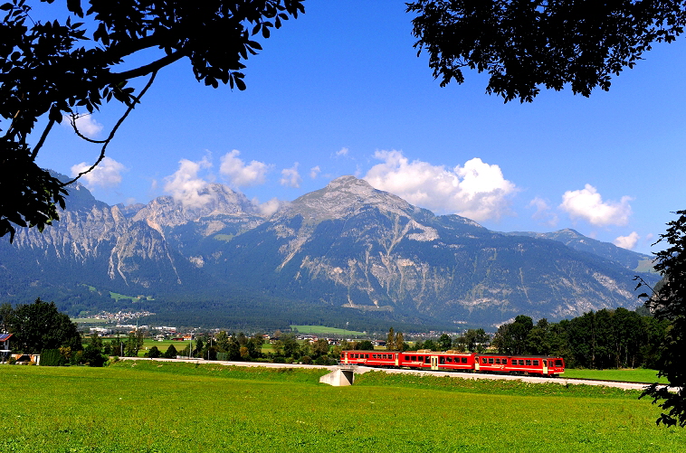 In Höhe der Zillertaler Bundesstraße entstand das Bild dieser besonderen Komposition. In dem planmäßigen Regionalzug von Jenbach nach Mayrhofen und zurück wurde am 24. September 2016 der Triebwagen VT 1 eingereiht. Der Grund dieser Maßnahme lag darin begründet, dass in Hippach ein Alm Abtrieb stattfand, der zu einer höheren Fahrgast Frequenz führen sollte. |