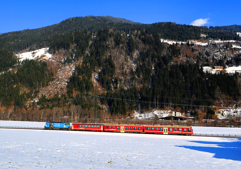 Gegen Mittag des 18. Februar 2013 ist die D 16 mit einem Regionalzug in Richtung Jenbach unterwegs und wird in Kürze den Bahnhof von Aschau im Zillertal erreichen.